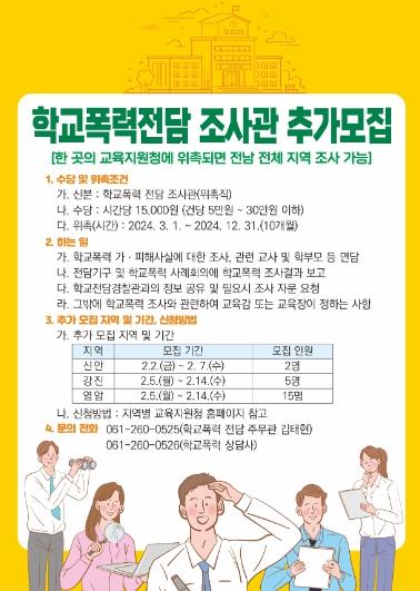 강진교육지원청은 2월 5일부터 14일까지 5명을 모집하고, 영암교육지원청은 같은 기간 15명을 모집한다. 또, 신안교육청은 2월 2일부터 7일까지 2명을 모집한다. 위촉된 학교폭력전담조사관은 전남 전 지역에서 활동이 가능하다.