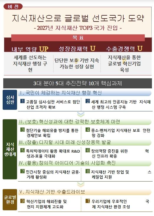미국?중국 등 주요국들이 글로벌 기술패권 경쟁 심화에 따라 첨단기술의 주도권 확보를 위해 적극적으로 지식재산 정책을 펼치고 있는 가운데, 특허청은 2024년 ‘심사?심판’, ‘국내 지식재산 생태계’, ‘글로벌 환경’ 등 3대 분야에 걸쳐 내부역량?성장잠재력?수출경쟁력 강화를 목표로 5대 추진전략 및 10개 핵심과제를 마련했다.