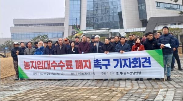 [중앙뉴스라인, 이상권기자] 전남도의회 박형대 의원(진보당,장흥1)은 지난 2월 15일 한국농어촌공사 앞에서 전국농민회총연맹 광주전남연맹과 함께 농지임대수수료 폐지를 촉구하는 기자회견에 참석했다.