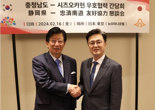 해외시장 확대 교두보 설치 등을 위해 일본을 방문 중인 김태흠 지사는 16일 일본 도쿄 뉴오타니호텔에서 가와카츠 헤이타 시즈오카현지사를 만났다.