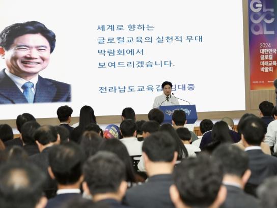 김대중 교육감은 “K-팝, K-드라마가 지구촌의 한류를 주도하듯이 2024 대한민국 글로컬 미래교육 박람회는 ‘K-에듀’의 시작이 될 것이다.”며 “이 박람회를 반드시 성공시켜 대한민국 K-교육의 대전환을 이루고, 그 성과가 전남 학생과 교실로 전해지기를 기대한다.”고 말했다.