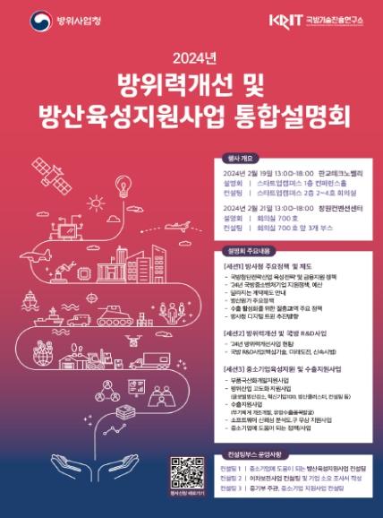 [중앙뉴스라인, 우제헌기자] 방위사업청은 2월 19일, 21일 이틀 동안 방산분야에 참여하고 있거나 참여를 희망하는 대?중소?벤처기업 등을 대상으로 2024년 착수 예정인 주요 방위력개선 사업과 방산육성 정책 및 지원 사업, 달라지는 계약?원가?절충교역 제도 등에 대해 설명하고 이해를 돕기 위한‘2024년 방위력개선 및 방산육성지원 사업 통합설명회’를 개최한다.