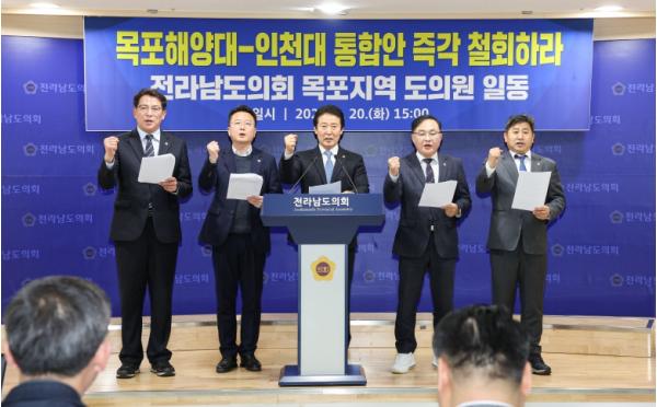 성명서를 대표로 발표한 전남도의회 전경선(더불어민주당, 목포5) 부의장은 “인구 감소와 지방소멸의 위기 상황에서 지방대학들이 생존을 위한 전략을 모색 중이며 목포해양대가 정책공모를 위한 공론의 장을 마련한 점은 높이 평가할 점이나, 지역과 상생 발전할 수 있는 목포대와의 통합안이 아닌 인천대와의 통합을 결정한 것은 잘못된 판단이다”고 지적했다.