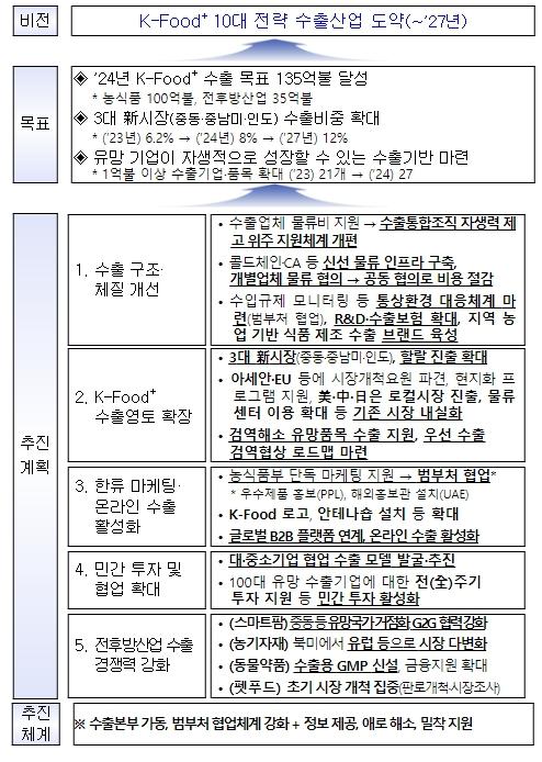 정부는 이번 대책에서 ‘10대 전략 수출산업으로 도약하는 K-Food+’를 비전으로 삼고, 올해 K-Food+ 135억불, ’27년까지 230억불을 수출 목표로 설정했다. 이번 대책은 지난해 'K-Food+ 수출확대 추진본부'를 운영하며 논의된 개선과제들과 현장의 의견을 기반으로 마련됐다