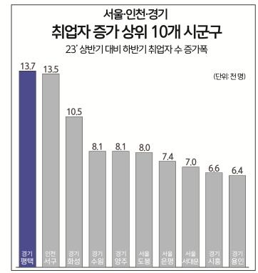 같은 기간 수도권에서 취업자 증가 폭이 1만 명을 넘은 시군구는 단 3곳으로, 인천 서구(1만3500명), 경기 화성시(1만500명)가 평택시 뒤를 이었다.