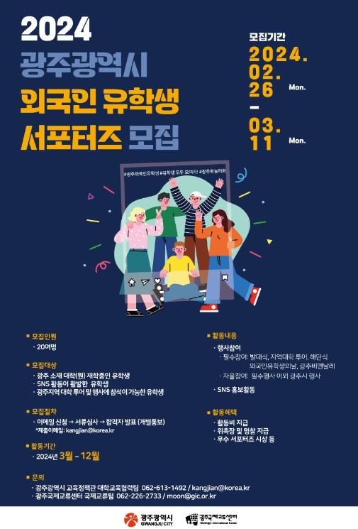 [중앙뉴스라인, 김병연기자] 광주광역시는 지역대학을 홍보하고 광주시를 널리 알리는 역할을 담당할 ‘외국인 유학생 서포터즈’를 20명 모집한다.