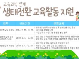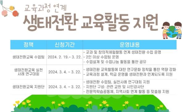 ‘생태전환교육 지원단’은 관내 교원과 지역사회 활동가를 중심으로 구성해 ‘생태전환교육 수업팀’과 ‘실천사례 연구대회’를 지원하는 역할을 한다. 또한 학교 현장에서 생태전환교육 수업에 관심있는 교사들에게 전문적 학습공동체 구성 및 지역사회 연계 활동 등 맞춤형 지원을 할 예정이다.