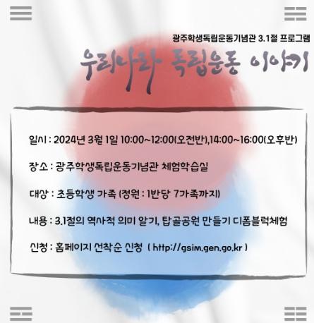 [중앙뉴스라인, 김병연기자] 광주학생독립운동기념회관이 제103주년 3·1절을 맞아 관내 초등학생과 가족들을 대상으로 기관 내 위치한 체험학습실에서 ‘우리나라 독립운동 이야기’ 프로그램을 운영한다.