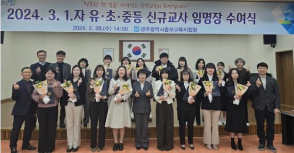 [중앙뉴스라인, 김병연기자] 광주동·서부교육지원청이 28일 동·서부 관내 소재 유·초·중학교 신규교사 45명(유치원 7명, 초등학교 24명, 중학교 14명)에 대한 임명장 수여식을 각각 열었다.