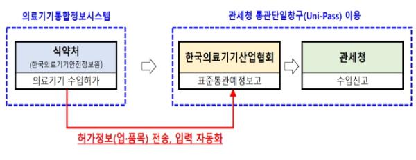 기존에는 민원인이 표준통관예정보고를 위해 식약처로부터 받은 의료기기 허가에 대한 정보 13종*을 관세청 통관단일창구(Uni-Pass)에 직접 일일이 입력해야 했으나, 앞으로는 관세청·한국의료기기산업협회와 정보 공유를 통해 허가정보가 자동으로 입력되도록 개선했다.
