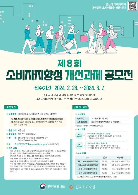 [중앙뉴스라인, 우제헌기자] 공정거래위원회와 한국소비자원(원장 윤수현)은 소비생활에서 경험한 불편 사항 등에 대해 소비자의 다양한 의견과 아이디어를 듣고 이를 법·제도 개선에 반영하고자 '제8회 대국민 소비자지향성 개선과제 공모전'을 개최한다.