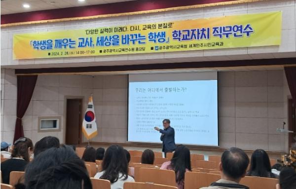 [중앙뉴스라인, 김병연기자] 광주시교육청이 지난 28일 광주교육연수원 중강당에서 초·중·고 교원 및 교육전문직원 130여 명이 참석한 가운데 ‘학생을 깨우는 교사, 세상을 바꾸는 학생’을 주제로 학교자치 현장 맞춤형 연수를 실시했다.