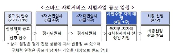 [중앙뉴스라인, 우제헌기자] 보건복지부는 2024년 신규사업인 ‘스마트 사회서비스 시범사업’에 참여할 기업을 선정하기 위해 인공지능(AI), 디지털, 로봇 등 첨단복지기술을 보유한 기업을 대상으로 2월 28일부터 3월 19일까지 공모를 실시한다고 밝혔다.