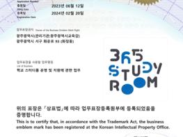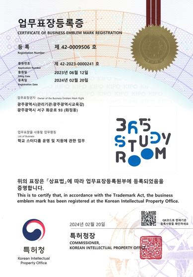 ‘365-스터디룸’은 시교육청 대표 브랜드로 타 기관과 단체에서 영리목적 사용을 차단하고 공공성을 확보하기 위해 업무표장 등록을 추진했다. 업무표장은 비영리 업무를 하는 자가 그 업무를 나타내기 위해 사용하는 상표이다. 지난해 5월 상표 출원해 등록 완료까지 9개월의 시간이 소요됐으며 등록일로부터 10년간 지식재산권(상표사용권)이 존속된다.