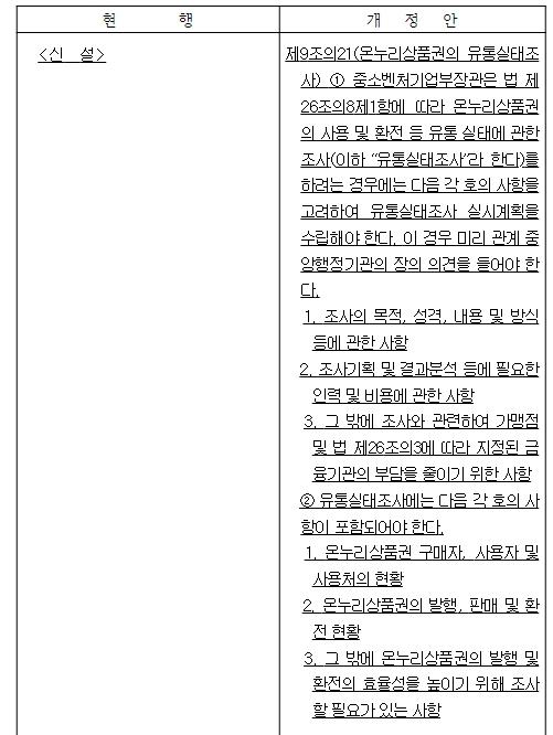 이번 시행령 개정은 온누리상품권 유통 실태조사 근거 및 자료 요청 권한 등을 규정하는 ?전통시장 및 상점가 육성을 위한 특별법?이 작년 9월 14일에 개정됨에 따라 시행령에 위임된 필요 사항을 정하는 후속 조치이며, 이번 국무회의 의결을 거쳐 공포일로부터 6개월 후인 올해 3월 15일에 시행된다.