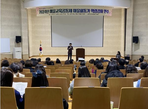 연수는 ▲ 2024년 마을교육공동체 사업 안내 ▲ 광주 마을교육공동체의 가치 ▲ 마을교육공동체 사례 공유 ▲ 마을교육공동체 행정사항 공유 등으로 구성됐다.