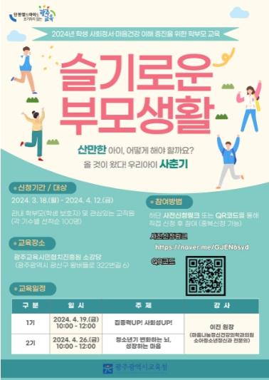 [중앙뉴스라인, 손기주기자] 광주시교육청이 오는 4월 19일과 4월 26일 2차례 광주교육시민협치진흥원 소강당에서 학부모(보호자) 대상 학생 사회정서·마음건강 이해 증진을 위한 학부모 교육 ‘슬기로운 부모 생활’을 실시한다.