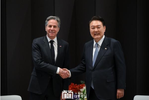 대통령은 지난해 11월에 이어 4개월 만에 다시 방한한 블링컨 국무장관을 환영하고, 최근 한미 외교장관 간 상호 방문을 포함해 고위급 교류가 활발하게 이루어지고 있는 것은 ‘글로벌 포괄 전략동맹’으로 진화한 한미동맹의 공고함을 잘 보여준다고 했다.