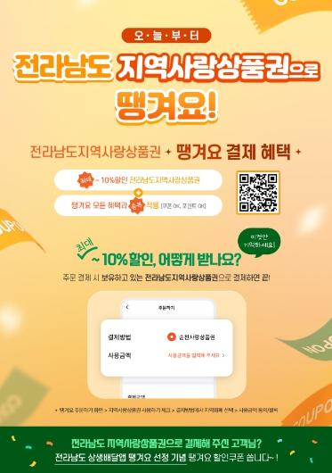 [중앙뉴스라인, 김민수기자] 전라남도가 운영 중인 상생배달앱 ‘땡겨요’가 21일부터 지역사랑상품권과 결제가 연동돼 소비자 편의가 증대될 것으로 보인다.