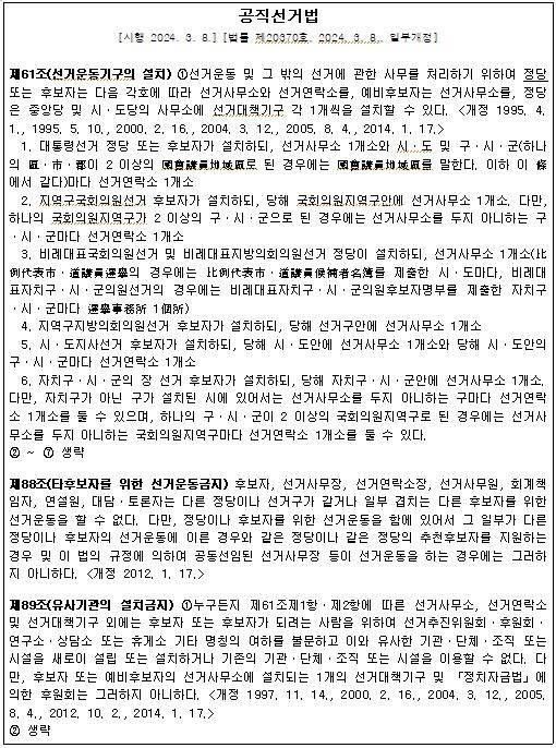다만, 정당 간 공동선거대책기구를 구성하는 것은 불가하다. 법 제61조(선거운동기구의 설치)에 따라 선거사무소, 선거연락소, 선거대책기구 등은 각 1개씩 설치할 수 있고 그 외에 이와 유사한 선거운동기구를 추가로 설립·설치하는 경우 법 제89조(유사기관의 설치금지) 규정에 위반되는 것으로 볼 수 있다.