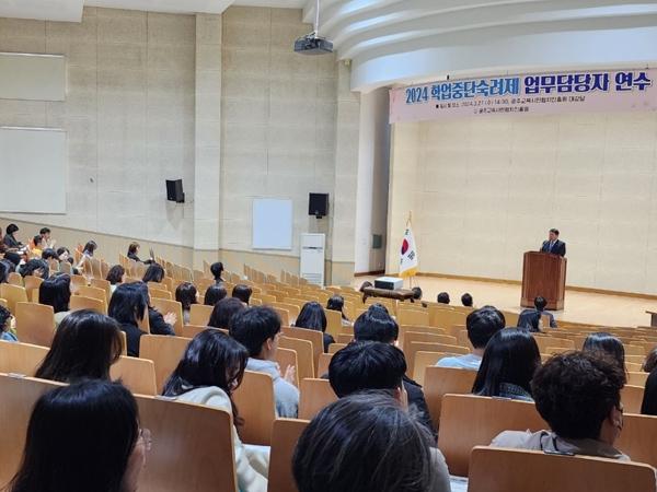 연수는 ▲2024 학업중단숙려제 운영 계획 ▲나이스(NEIS) 업무처리 ▲학업중단숙려제 기관 안내 등의 내용으로 진행됐으며, ‘2024 학업중단숙려제 길라잡이’를 배부해 업무 담당자들이 보다 안정적으로 ‘학업중단숙려제’를 현장에서 운영할 수 있도록 지원했다.