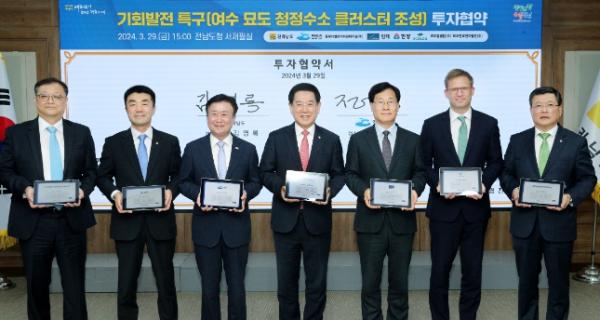 [중앙뉴스라인, 김민수기자] 전라남도는 29일 도청 서재필실에서 여수 묘도에 수소산업 클러스터 조성을 위해 5개 기업과 3조 9천200억 원 규모의 기회발전특구(청정수소 클러스터 조성) 투자협약을 했다고 밝혔다.