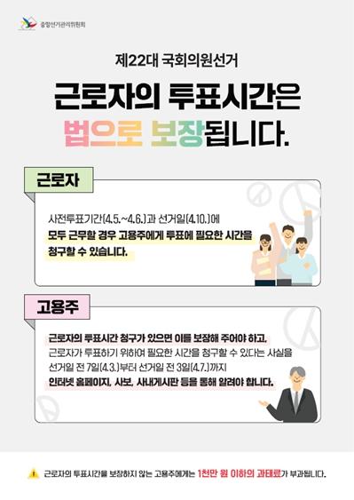 세종?대전?충남선관위는 근로자가 제22대 국회의원선거 사전투표기간(4월 5일~6일)과 선거일(4월 10일)에 모두 근무하는 경우 고용주에게 투표에 필요한 시간을 청구할 수 있다고 밝혔다.