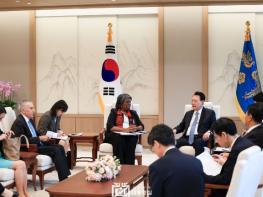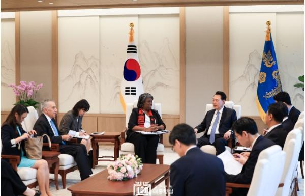 [중앙뉴스라인, 우제헌기자] 윤석열 대통령은 4월 15일 오후 방한 중인'린다 토마스-그린필드(Linda Thomas-Greenfield)'주유엔 미국대사를 접견하고, 유엔 안보리 이사국 활동, 한미 동맹, 북한 문제 등에 대해 의견을 교환했다.
