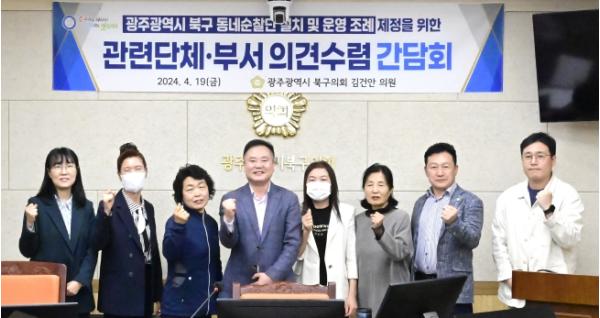 [중앙뉴스라인, 손기주기자] 광주 북구의회 김건안 의원(우산동,문흥1·2동,오치1·2동)이 지난 19일 ‘광주광역시 북구 동네순찰단 설치 및 운영 조례’ 제정을 위한 관련단체 및 부서 의견수렴 간담회를 개최했다.