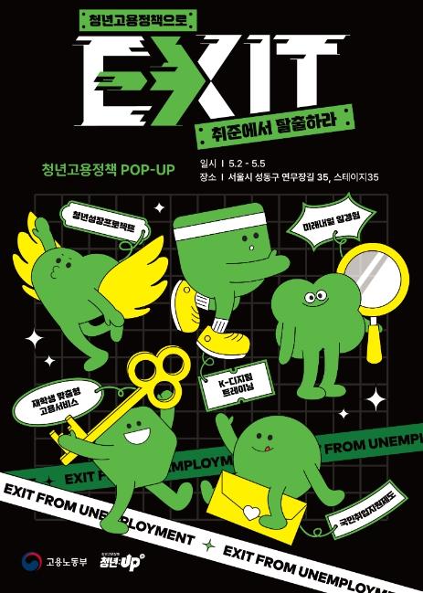 청년고용정책 팝업스토어는 “청년고용정책으로 취준에서 탈출(EXIT)하라”는 컨셉으로 청년들이 체험을 통해 자연스럽게 청년고용정책을 이해하고 체감할 수 있도록 ‘방탈출 게임’, ‘에어볼 게임’ 등으로 구성되어 있다. ‘방탈출 게임’은 정책 정보를 단서로 방을 탈출하기 위한 미션을 해결하는 게임이며 ‘에어볼 게임’은 청년들이 원하는 정책을 고르고 해당 정책이 적힌 에어볼을 획득하는 게임이다. 그리고 취준생활 탈출을 응원하는 EXIT를 형상한 ‘포토존’ 등도 마련되어 있다. 이러한 액티비티 체험을 완료하여 스탬프 미션에 성공한 청년들은 소정의 경품도 받을 수 있다.