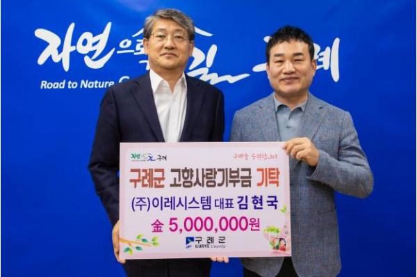 [중앙뉴스라인, 이승훈기자] 전남 구례군은 (주)이레시스템의 김현국 대표가 지난달 29일 구례군에 고향사랑기부금 최고액인 500만 원을 기탁했다고 밝혔다.
