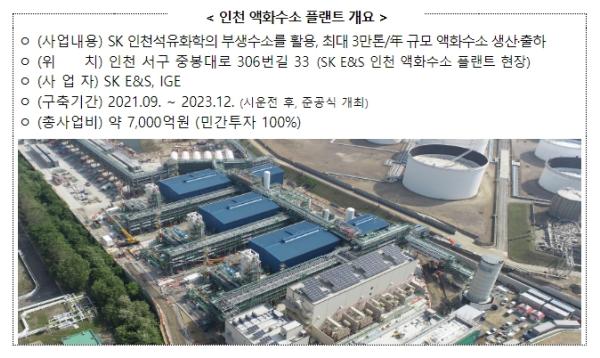 ?인천 액화수소 플랜트?는 SK E&S가 총 7천억 원을 투자해 구축한 것으로, 최대 연 3만 톤의 액화수소를 생산할 계획이다. 이는 연간 약 5,000대의 수소버스가 충전할 수 있는 규모로, SK E&S는 동 플랜트와 연계해 금년중 약 20개소를 시작으로 '26년까지 총 40개소의 액화충전소를 전국에 구축하여 액화수소 유통망을 조성해 나갈 계획이다.