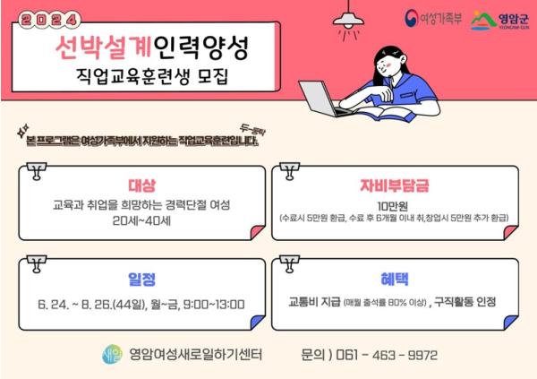 [중앙뉴스라인, 전은희기자] 영암여성새로일하기센터가 6월 진행될 선박설계 인력양성 직업교육훈련 과정에 참여할 20~40세 취·창업 희망 경력단절여성을 모집한다.
