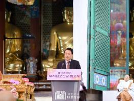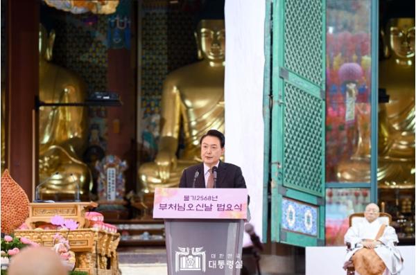 [중앙뉴스라인, 우제헌기자] 윤석열 대통령은 5월 15일 오전 조계사 대웅전 앞 특설법단에서 열린 '불기 2568년 부처님오신날 봉축 법요식'에 참석했다. 오늘 행사는 대한불교조계종이 주관했으며, 올해의 봉축표어는 "마음의 평화, 행복한 세상"이다.
