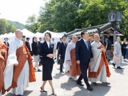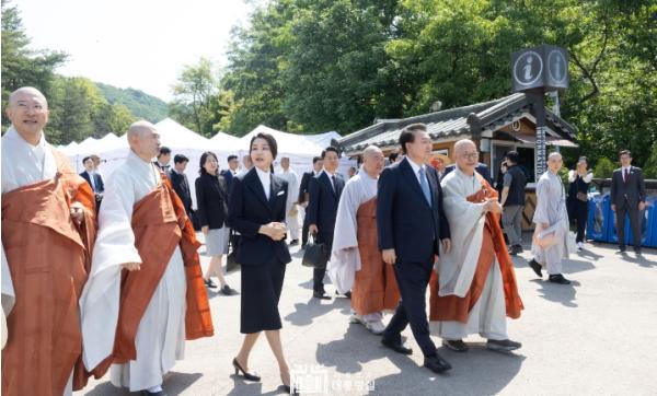 [중앙뉴스라인, 우제헌기자] 윤석열 대통령 부부는 5월 19일 오전 경기도 양주회암사지에서 열린 '회암사 사리 이운 기념 문화축제 및 삼대화상 다례재'에 참석했다.