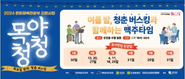 목요일 밤의 청춘 버스킹 ‘목야청청’이라는 명칭으로 진행되는 이 사업은 강진읍 일대에 차 없는 거리를 적용해 다양한 장르의 거리공연을 통해 문화를 통해 지역상권을 활성화하고자 하는 목적으로 마련됐다.