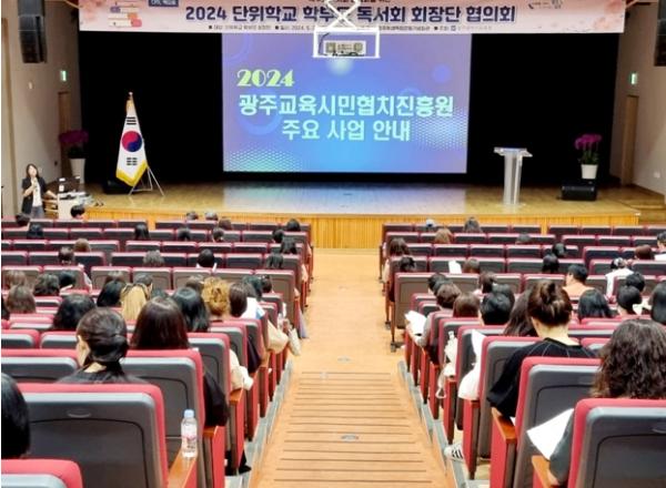 [중앙뉴스라인, 손기주기자] 광주시교육청이 23일 광주학생독립운동기념회관 대강당에서 각 학교 학부모 독서회 대표 170여 명 대상으로 ‘단위학교 학부모 독서회 회장단 협의회’를 개최했다.