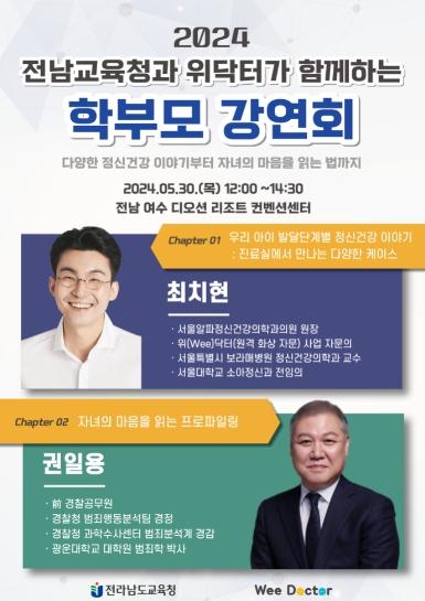 [중앙뉴스라인, 김민수기자] 전라남도교육청은 30일 여수 디오션호텔에서 ‘전남교육청과 위(Wee) 닥터가 함께하는 학부모 강연회’를 개최한다.