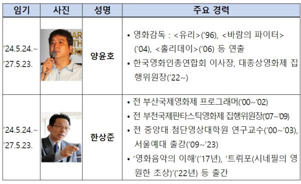 신임 위원 2명은 ?양윤호 한국영화인총연합회 이사장과 ?한상준 전 부천국제판타스틱영화제 집행위원장(가나다순)이며 이들은 영화계 각 분야에서 활발하게 활동해 온 전문가들이다.