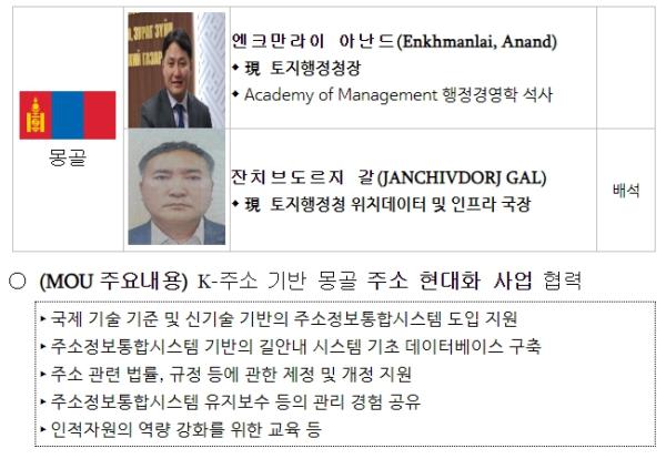 또한, 주소 관련 인적자원의 역량 강화 교육을 위한 인적 교류 등 몽골 주소 현대화 사업추진과 관련한 포괄적 협력을 약속했다.