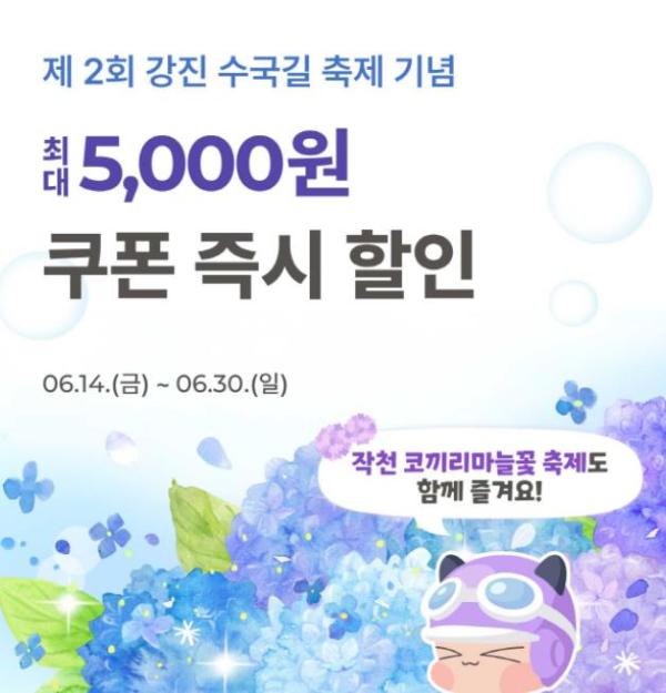 작천면 부흥마을 코끼리마늘 재배단지 일원에서 개최되는 ‘작천 코끼리마늘꽃 3 Days’와 보은산 V랜드공원 일원에서 개최되는 ‘제2회 강진 수국길축제’ 기간에 강진군 상가 활성화를 위해 추진되는 이벤트로 사업비 1,000만원 소진때까지 진행될 예정이다.