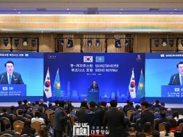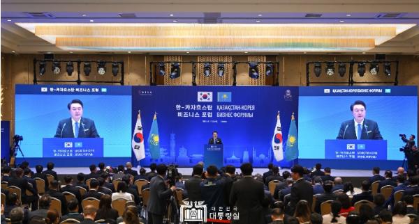 [중앙뉴스라인, 우제헌기자] 카자흐스탄을 국빈 방문 중인 윤석열 대통령은 6월 12일 오후 힐튼 아스타나 호텔에서 열린 ?한-카자흐스탄 비즈니스 포럼?에 참석했다. “협력을 넘어 동반으로”라는 주제로 열린 오늘 포럼에는 카슴 조마르트 토카예프 카자흐스탄 대통령도 함께 참석했다.
