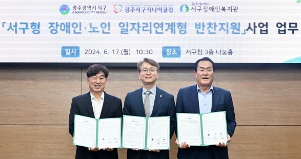 [중앙뉴스라인, 전은희기자] 광주광역시 서구가 장애인?노인 공공일자리 협업을 통해 복지 사각지대 해소에 나선다. 서구는 17일 서구청 나눔홀에서 광주서구시니어클럽, 광주광역시 서구장애인복지관과 서구형 장애인-노인 일자리 연계형 반찬지원사업 업무협약을 체결했다.