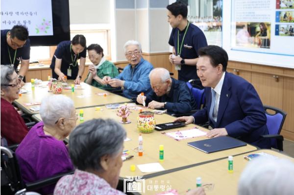 대통령은 먼저 재활치료실을 찾아 국가유공자 어르신들이 이용하는 물리치료, 작업치료 및 심리안정치료를 참관한 후, 요양동으로 이동해 입소 어르신들께 요양원 생활은 어떠신지, 지내는 데 불편한 점은 없으신지 등을 물으며 안부를 챙겼다. 대통령은 이 자리에서 6·25 참전 국가유공자 어르신들에게 ‘영웅의 제복’을 선물하며 국가에 대한 헌신에 감사를 표했다. 그간 정부는 국가유공자 어르신들의 헌신이 제대로 존중받는 사회를 실현해 나가겠다고 강조해 온 바 있다.