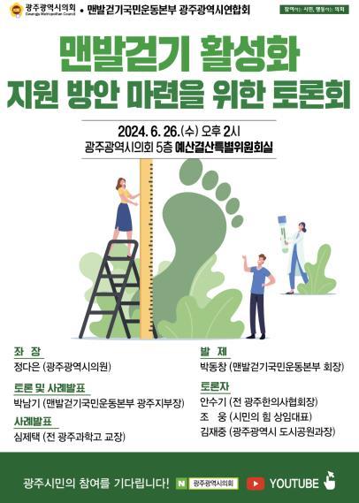 정다은·박미정 광주시의원이 주최하고 맨발걷기 국민운동본부 광주광역시연합회가 주관한 이번 토론회는 맨발걷기의 체험 사례와 효과를 공유하고 맨발걷기 지원 활성화를 위한 방안 모색을 위해 마련됐다.