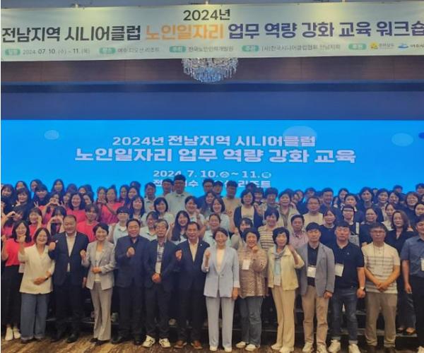2024년 전남지역 시니어클럽 노인일자리 업무 역량 강화 교육은 7월 10일 부터 이틀간 여수 디오션리조트에서 열렸으며, 시니어클럽 종사자 역량 공유 및 효과적인 노인 일자리 프로그램 운영을 위한 교육과 사례 중심 맞춤형 노무교육을 실시했다.