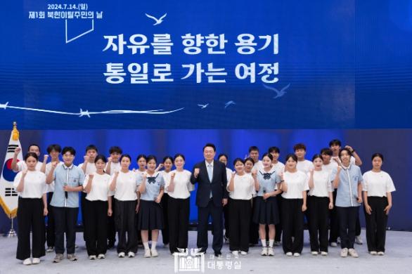 [중앙뉴스라인, 우제헌기자] 윤석열 대통령은 오늘(7. 14, 일) 오전 청와대 영빈관에서 개최된 ‘제1회 북한이탈주민의 날 기념식’에 참석했다. ‘북한이탈주민의 날’은 대통령이 지난 1월 16일 국무회의에서 북한이탈주민을 따뜻하게 포용하고 성공적인 정착을 격려하기 위해 제정을 약속한 것으로, 북한이탈주민의 날 기념식을 개최한 것은 역대 정부 중 이번이 처음이다.