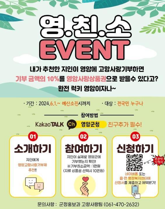 지난달부터는 내가 추천한 지인이 영암에 고향사랑기부하면 추천자에게 기부금액의 10%를 영암사랑상품권으로 지급하는 ‘영·친·소’ 이벤트도 진행하고 있다.