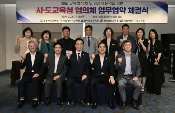 [중앙뉴스라인, 김민수기자] 전라남도교육청이 18일 호텔현대 바이 라한 울산에서 경북교육청, 경남교육청, 강원교육청, 부산교육청 등 4개 교육청과 지속적인 해외 유학생 유치 및 공동 수행을 위한 업무협약을 체결했다.
