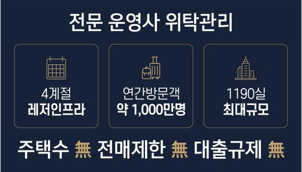 대원칸타빌 정선은 지하 2층~지상 15층에 1190실의 정선 지역 최대 규모로 조성된다. 발코니 도입으로 공간활용을 극대화하고, 풀옵션 제공으로 편리한 이용을 돕는다. 공급하는 전호실이 사북지역 특성상 수요가 가장 많은 원룸형으로 구성되어 있는 대원칸타빌 정선은 29실의 근린생활시설도 있어 이용객의 편의성을 도모한다. 최저 1억1,379만원~최고 1억3649만원 1억초반이라는 보기 드문 가격대로 형성됐다는 것은 현재 건축자재와 인간비 상승 여파로 강원지역 내에 다시 책정되기 힘든 분양가로 볼 수 있다. 특히 주택수 미포함으로 다수 객실을 계약하는 사례도 증가하고 있다”고 말했다.